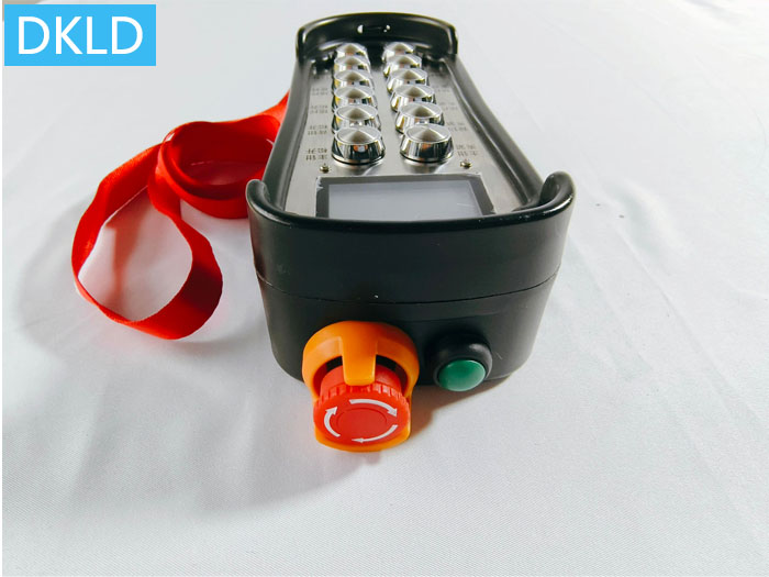 發(fā)射器面板布局:12個(gè)不銹鋼金屬按鍵,另有3個(gè)鈕子開關(guān)(小撥桿),頂部自帶遙控器系統(tǒng)本身的啟停按鈕,及歐規(guī)急停蘑菇頭旋鈕。