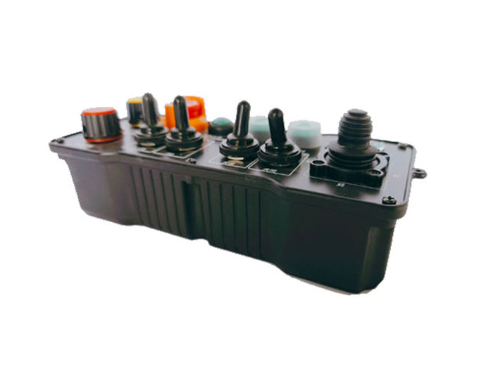 左邊前后2個(gè)輪子視為一個(gè)驅(qū)動(dòng),右邊前后2個(gè)輪子視為1個(gè)驅(qū)動(dòng),針對(duì)左右兩驅(qū)動(dòng),各布局1個(gè)三位自復(fù)位扭子開關(guān);油門加減速布局1個(gè)電位器控制;汽油機(jī)的啟動(dòng)和熄火,布局為2個(gè)按鍵控制,點(diǎn)動(dòng)模式,且兩者互鎖邏輯,對(duì)應(yīng)接收器端2路繼電器輸出。
